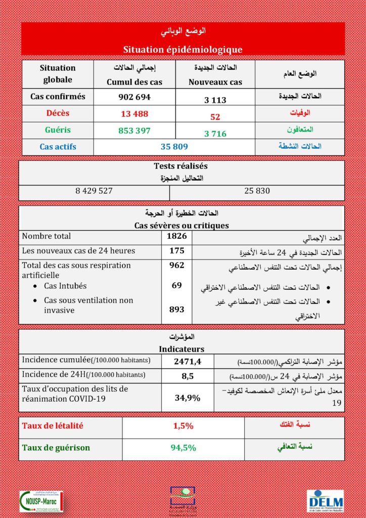 3.113 nouveaux cas soit un cumul de 902.694 cas à ce jour.