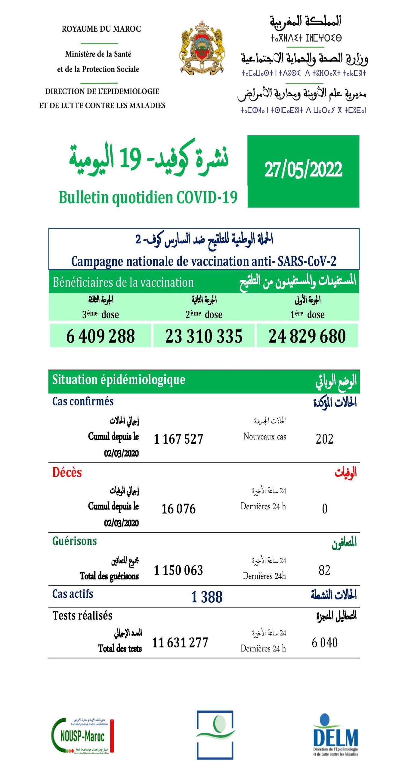 202 nouveaux cas soit un cumul de 1.167.527 cas à ce jour.