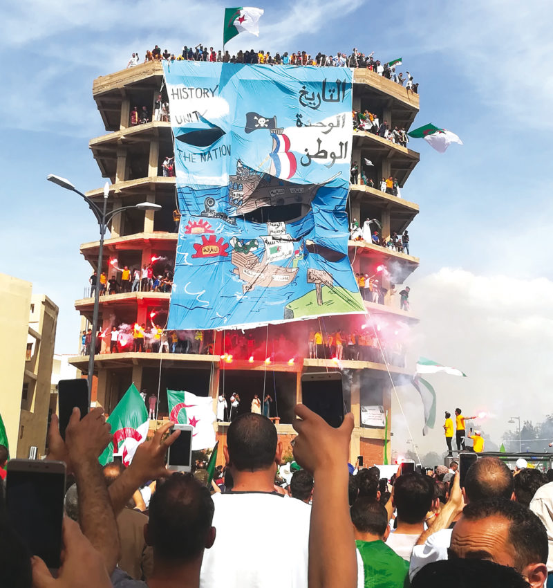 Le noyau de l’autre groupe lance des slogans favorables à l’armée mais que la foule ne reprend guère. La carcasse d’immeuble inachevé rebaptisée «palais du Peuple» est entièrement occupée par les gilets jaunes. Ils passent pour être du quartier d’El Djebass, l’un des fiefs du hirak, mais également connu pour être l’un des plus défavorisés de la ville. La grande foule au bas de l’immeuble attend le moment où le tifo sera enfin déployé et dévoilé.