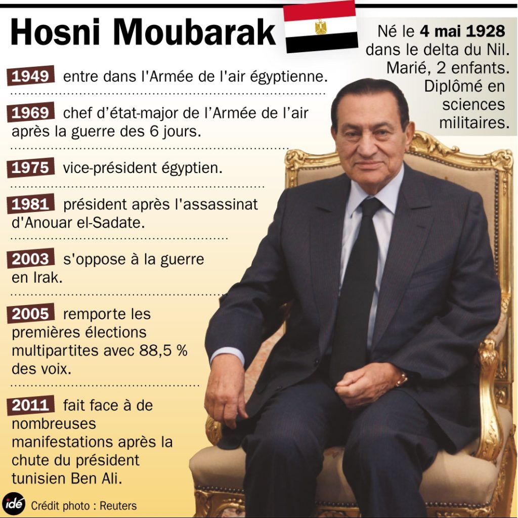La télévision publique égyptienne a annoncé que l’ancien président du pays, Hosni Moubarak, évincé lors du printemps arabe en 2011, est décédé à l’âge de 91 ans dans un hôpital du Caire.