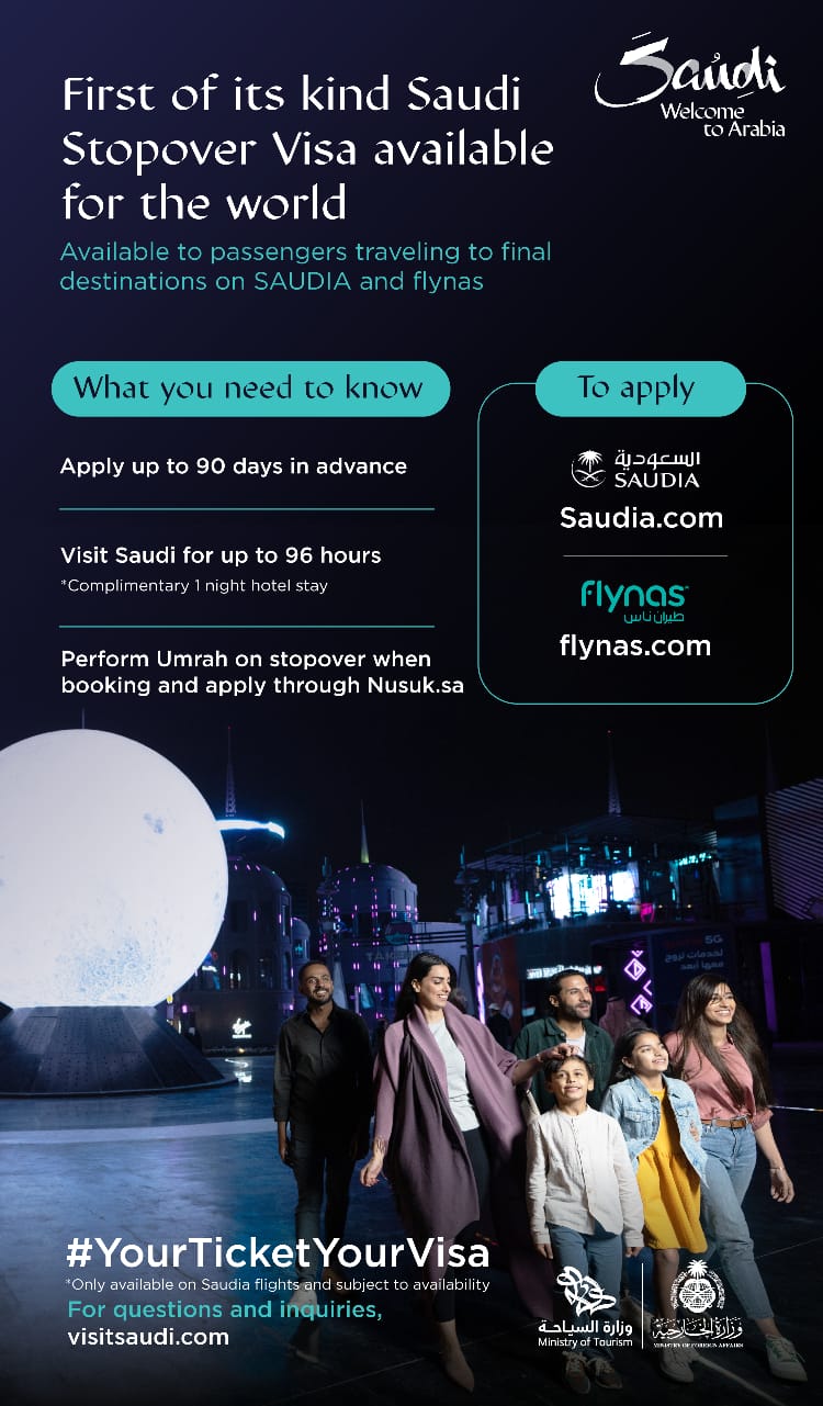 Le Royaume d’Arabie saoudite a conçu un nouveau visa de transit, permettant aux voyageurs internationaux via Saudi Arabian Airlines et flynas de s’arrêter dans le Royaume pour une durée allant jusqu’à 96 heures, lorsqu’ils ajoutent une escale dans l’un des aéroports du Royaume, avant d’atteindre leur destination finale.Les voyageurs internationaux peuvent avoir un visa de transit automatiquement et gratuitement, jusqu’à 90 jours avant le voyage, facilement à travers les plateformes électroniques dédiées à la réservation des vols sur Saudi Airlines et Flynas, pour profiter des destinations touristiques du Royaume, de la diversité naturelle et climatique, et les monuments historiques et patrimoniaux, mais aussi pour découvrir la culture de la générosité et de l’hospitalité très bien connue au sein de la société saoudienne authentique.