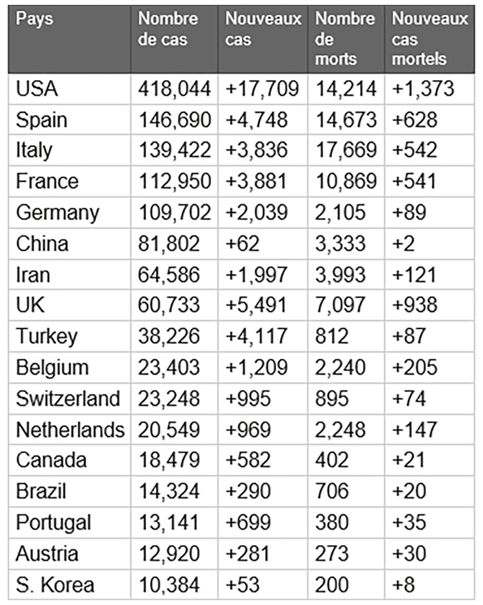 • Les USA détiennent le chiffre le plus élevé des cas de décès au monde suivis de l’Italie et de l’Espagne,