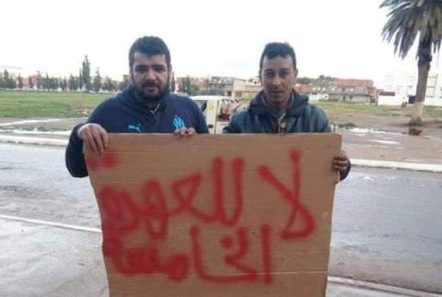 Hadj Ghermoul et le blogueur Rezouane Kada, brandissent une pancarte : « Non à un cinquième mandat».Hadj Ghermoul, 37 ans, un jeune de la ville de Tizi, à 8 km de Mascara, militant de la Ligue algérienne de défense des droits de l’homme (LADDH) et membre du Comité national de défense des droit des chômeurs (CNDDC), est en prison depuis sa comparution immédiate, mardi 29 janvier.