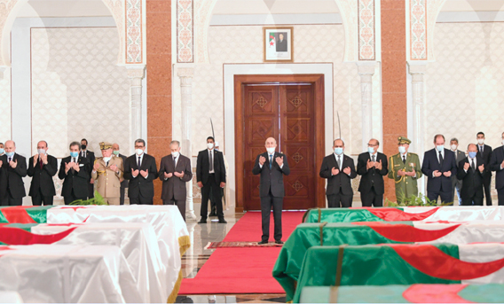 D.RL’avion militaire C-130 transportant les restes mortuaires des 24 résistants algériens à la colonisation française, escorté par des avions de chasse, en provenance de France, a atterri en début d’après-midi à l’aéroport Houari-Boumediène. Le Président de la République, chef suprême des Forces armées, ministre de la Défense nationale, M. Abdelmadjid Tebboune, a présidé la cérémonie d’accueil des cercueils, en présence de hauts cadres de l’Etat dont le président du Conseil de la nation par intérim, Salah Goudjil, le président de l’Assemblée populaire nationale, Slimane Chenine, le Premier ministre Abdelaziz Djerad, le chef d’état-major de l’ANP, le général major Saïd Chanegriha, le général d’armée, commandant de la Garde républicaine Benali Benali, ainsi que des membres du gouvernement.