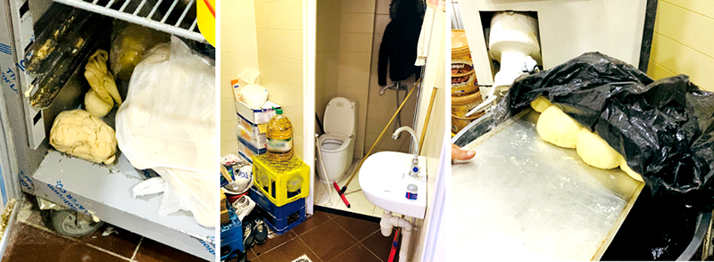 On constate les premières anomalies, des plateaux de fours collants de graisse, des raclettes à peinture pour remplacer les spatules et des sachets poubelles de couleur noire en guise de film transparent. Mais ce n’est pas tout, la matière première telle que la farine est entreposée sur le sol près des chaussures.