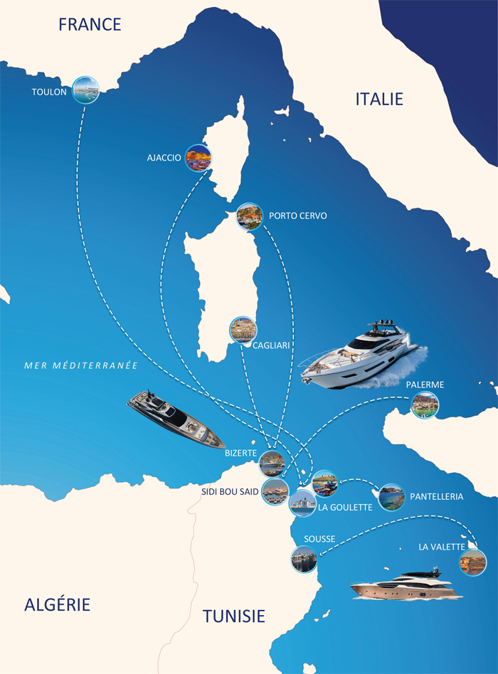 Une position exceptionnelle, don de la nature, depuis l’aube des temps. La Tunisie est à des distances très réduites de proches principaux ports de plaisance :