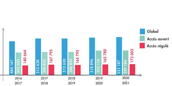 Depuis 2017 à 2021, 24 nouveaux établissements ont ouvert leurs portes dont 14 dans l’accès régulé et 10 dans l’accès ouvert. Leur nombre est ainsi passé de 124 à 148. Il y a lieu de relever que 2 nouveaux établissements ont ouvert en 2017-2018, 3 en 2018-2019, 13 en 2019-2020 et 6 en 2020-2021.