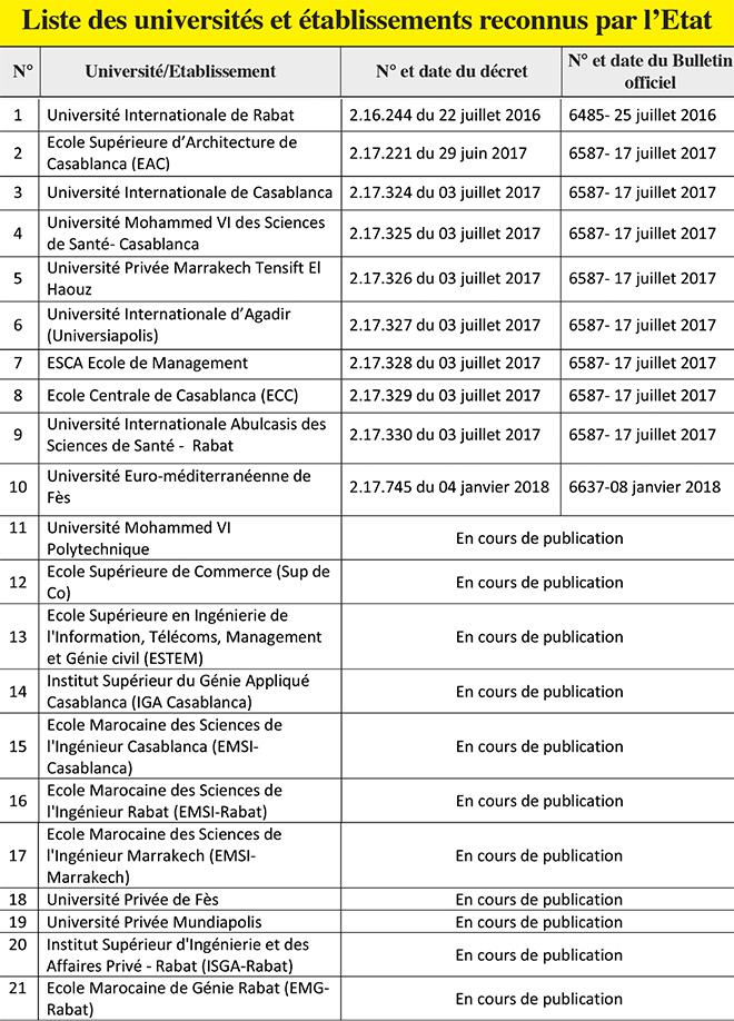 Statistiquement, les établissements privés du Royaume accueillent entre 15.000 et 20.000 nouveaux inscrits chaque rentrée universitaire. Ces établissements proposent un diplôme accrédité, délocalisé, en partenariat ou reconnu. Et c’est ce dernier type d’établissement qui enregistre le plus de demandes. En effet, les établissements reconnus bénéficient d’un partenariat avec l’Etat et dont la formation est sanctionnée par un diplôme équivalent à un diplôme étatique. Cela signifie que les lauréats de ces établissements disposent des mêmes droits que ceux titulaires d’un diplôme d’Etat, et peuvent prétendre à l’intégration dans la fonction publique. Au ce jour, 21 universités/établissements privés sont reconnus par l’Etat. «Il est à noter que les demandes de certains établissements nécessitent la satisfaction des conditions. D’autres demandes sont en cours d’évaluation. Aussi cette liste sera-t-elle mise à jour régulièrement au fur et à mesure de la reconnaissance d’autres établissements», précise le ministère de l’Enseignement supérieur.
