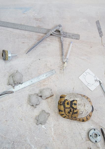 101 tortues sorties du joyeux capharnaüm de cet atelier unique en son genre qui, depuis 1993 –date de sa création, s’efforce de réinventer le patrimoine décoratif tunisien tout en œuvrant à sa préservation.