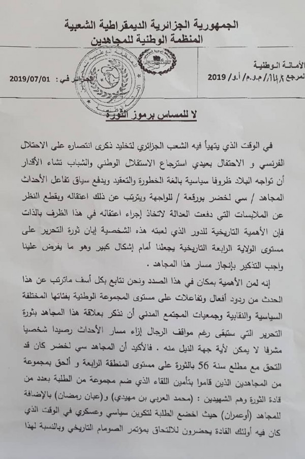 L’Organisation nationale des moudjahidine (ONM) a réagi à l’arrestation du moudjahid Lakhder Bouregaâ vingt-quatre heures après sa mise en détention préventive.
