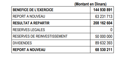 L’Assemblée Générale Ordinaire, prend acte du résultat bénéficiaire, dégagé au titre de l’exercice 2018 à hauteur de 144 930 891 dinars, et décide de l’affecter comme suit :