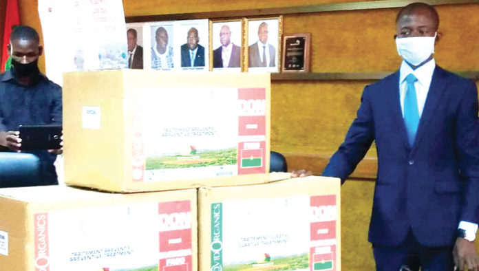 Trois cartons dont deux destinés à la prévention et un au traitement curatif du COVID-19 ont été offerts au Burkina.Le gouvernement malgache a fait don de son produit miracle contre le coronavirus au Burkina Faso. La cérémonie de remise de ce Covid-Organics a eu lieu, le 8 mai 2020 au ministère de la santé.