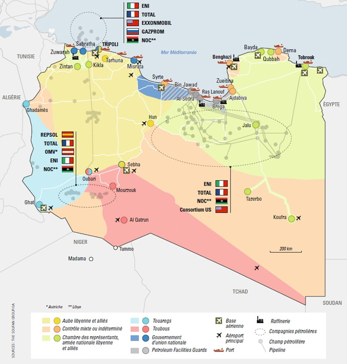 Jusqu’en décembre 2019, la Libye exportait 1.2 millions de barils jour. A cause de l’avancée des troupes de Haftar, l’occupation des ports et l’arrêt des pipelines connectant les puits aux ports, l’exportation a baissé à moins de 100 milles barils jour. Ces quantités sont produites on zone off-shore (plateau continental) par ENI (Italie) avec Total (France), OMV(Autriche) Gazprom (Russie), ExxonMobil (US/UK). Les bruts exportés sont connus sous les noms El Jourf et Bouri.