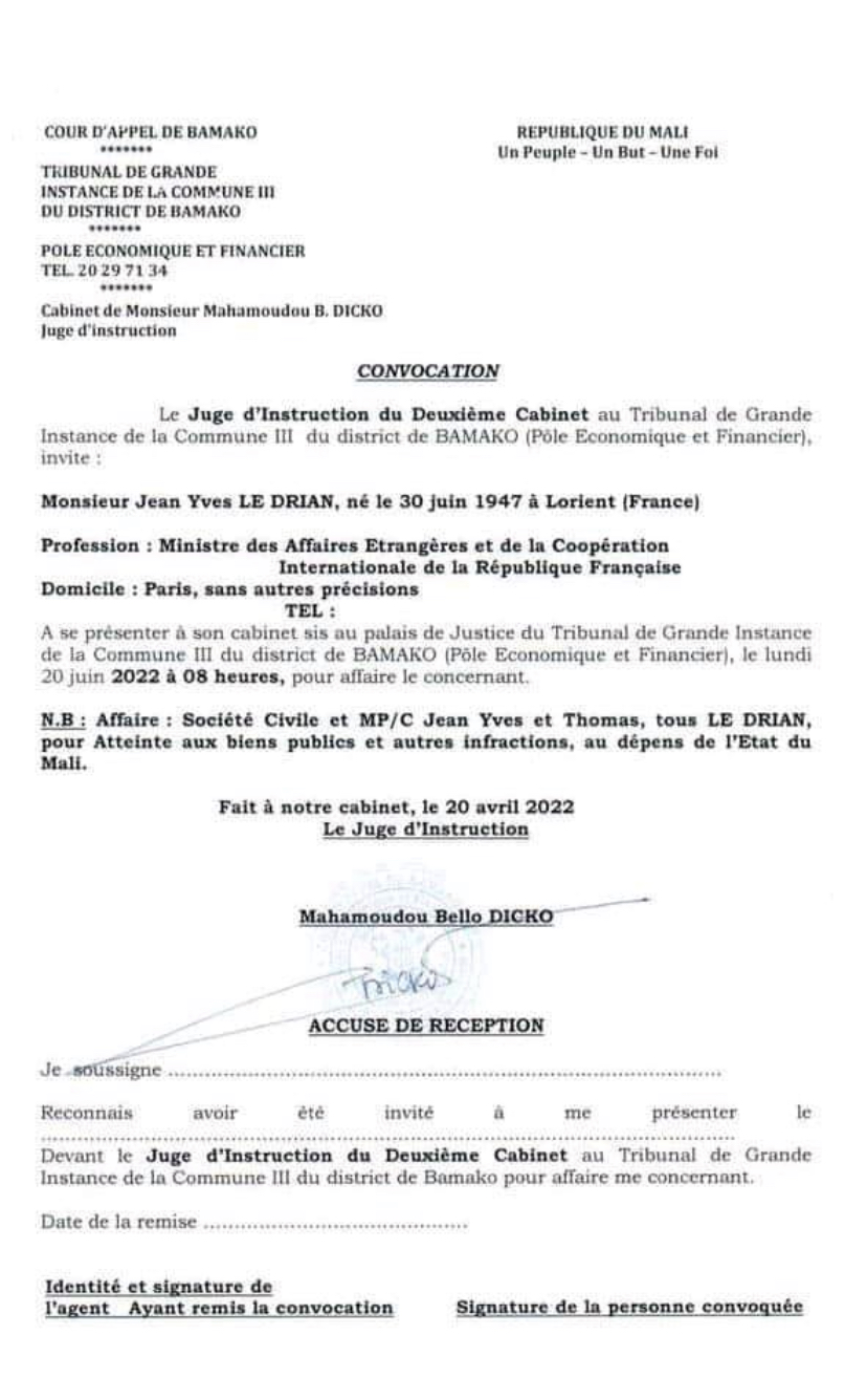 Au bas de la convocation émise le 20 avril, le juge malien rappelle que cette affaire a un lien avec la « société civile et MP/C Jean Yves et Thomas, tous Le Drian, pour atteintes aux biens publics et autres infractions aux dépens de l’Etat du Mali ».