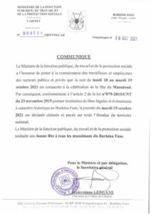 L’article Maouloud 2021: La journée du mardi 19 octobre déclarée chômée et payée(Communiqué) est apparu en premier sur Quotidien Sidwaya.