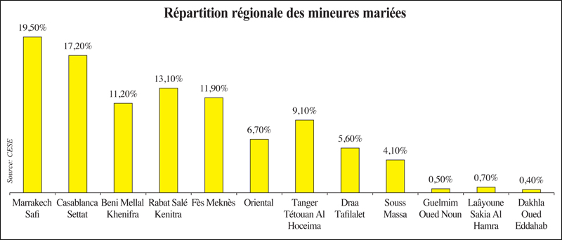 La répartition régionale des mineures mariées montre une prévalence élevée dans 5 grandes régions, particulièrement Marrakech-Safi et Casablanca Settat. En face, les niveaux les moins élevés sont enregistrés dans les 3 régions du Sahara.
