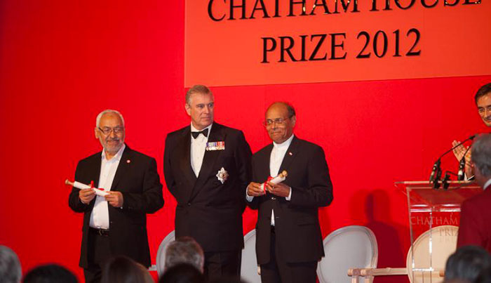 A noter que Cheikh Rached Ghannouchi et le Dr Moncef Marzouki ont reçu le prix 2012 de Chatham House décerné par Son Altesse Royale le duc d’York KG. La citation mentionne : « pour les compromis obtenus lors de la transition démocratique en Tunisie. Représentant les deux faces d’une même pièce, ils ont ensemble veillé à ce que la Tunisie reste au premier plan de la nouvelle vague démocratique au Moyen-Orient et en Afrique du Nord. »