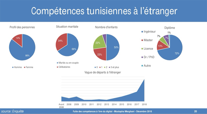 Le profil des candidats au départ n’est pas forcément celui que l’on croit, ce n’est pas des touts jeunes mais c’est en majorité des hommes mariés avec enfants, diplômés en l’occurrence ingénieur dans cette étude et ayant déjà une expérience professionnelle (Figure 2 – Compétences tunisiennes à l’étranger).