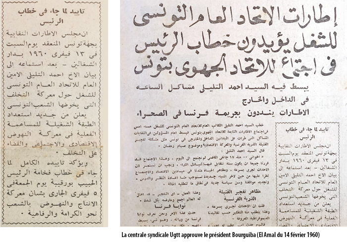 Ces accusations outrancières ne constituèrent qu’un des moyens employés par le régime et ses structures d’encadrement et de propagande contre la contestation du programme moderniste de la jeune et très autoritaire république. Les relais médiatiques furent mis en action et n’hésitèrent pas à recourir à l’intoxication. C’est ainsi que le journal El- Amal en date du 17 février 1960 publia, à la une, des titres mensongers tels que «Le mufti de Tunisie et le recteur de la Zitouna appuient théologiquement le discours du Président.» Quant à la déclaration – pourtant sans ambiguïté – du cheikh Ben Achour, elle fut reproduite mais tronquée, afin de semer le doute dans l’esprit des lecteurs. Le formidable appareil du Néo-Destour fut, bien entendu, mis à contribution. Les nombreuses cellules qui quadrillaient le territoire ainsi que les organisations nationales dont l’Ugtt furent mobilisées pour orchestrer «l’adhésion totale des masses autour du leader». Les télégrammes «spontanés» d’appui inconditionnel au chef de l’Etat affluaient de partout. Les rapports de fonctionnaires affirmaient que le discours du Palmarium «est favorablement accueilli ». Il arriva même que l’on informât un supérieur hiérarchique que «les récalcitrants sont généralement des vieillards ou des simples d’esprit». Enfin, des déjeuners officiels ou de travail furent organisés par provocation, en plein Ramadan et les figures de l’opposition qualifiées «d’insectes». Les prises de position de ces personnalités seraient dues «à l’aigreur de dignitaires déchus et de prévaricateurs punis par les temps nouveaux.» (in El- Amal du 27 février et numéros suivants).