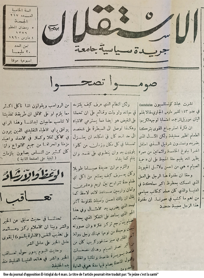 Le remplacement d’usages millénaires par les décisions novatrices de 1956 s’étant accompli sans graves incidents expliquerait, peut-être, le caractère intempestif du discours du 5 février 1960. Mais cette fois-ci, les deux plus hauts oulémas de Tunisie affichèrent une nette opposition, et le Président ne pouvait, sans mettre en péril son pouvoir et la stabilité du pays tout entier, faire passer en force sa réforme relative au jeûne du Ramadan. D’autant plus que la prise de position abrupte de Bourguiba ne manqua pas de réveiller l’hostilité au Code du statut personnel et à la suppression de la magistrature islamique. Outre le milieu zitounien, ces précédentes mesures n’avaient pas manqué d’alimenter le mécontentement des partisans et sympathisants de l’ancien puissant secrétaire général du Parti, Salah Ben Youssef. Nous savons, en effet, qu’au lendemain des accords franco-tunisiens d’autonomie interne, ce leader entra en conflit ouvert avec Habib Bourguiba, et axa son programme autour des thèmes, toujours séduisants au Maghreb, de la solidarité arabe et musulmane face à l’impérialisme. Or, malgré la répression sanglante qui s’était abattue sur les «yousséfistes» à partir de 1955, ceux-ci gardèrent une influence certaine, non seulement dans différents milieux conservateurs séduits par le rêve d’une «victoire par les armes» contre le colonialisme en Tunisie et en Algérie. Le mécontentement avait également gagné le « Vieux » Destour et s’exprima, durant des semaines, dans les colonnes du journal El Istiqlal de Moncef Mestiri.
