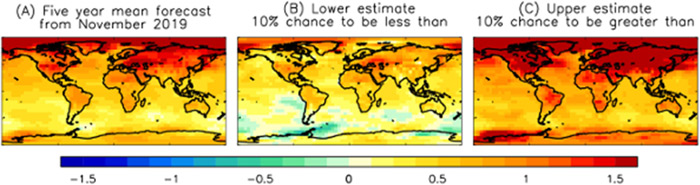 En effet, l’analyse des sorties des modèles numériques du climat révèlent que les cinq prochaines années pourraient être les plus chaudes jamais enregistrées. Les météorologistes du UK Met Office, parlent d’un réchauffement de la Terre de + 1,5°C d’ici 2024(Fig 1), alors que la moyenne des températures sur les cinq années à venir (2020-2024) devrait s’établir entre 1,15 °C et 1,46°C au dessus de l’ère préindustrielle (1850-1900, moyennes climatiques de référence auxquelles se font les comparaisons), des anomalies qui frôleraient la valeur critique fixée à 1.5°C dans l’accord de Paris en 2015.