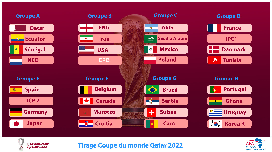 Les cinq représentants du continent noir connaissent désormais leurs adversaires en phase de groupes de la prochaine Coupe du monde de football.Le suspense vient d’être levé sur la composition des huit poules de la 22e édition du Mondial. Le tirage a été effectué ce vendredi au Palais des congrès de Doha, au Qatar. Le Sénégal, l’un des pays africains engagés dans la compétition, est gâté par le sort. La Tunisie, le Maroc, le Cameroun et le Ghana ne peuvent pas en dire autant.