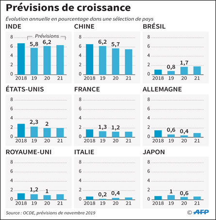 En 2018, le PIB mondial avait progressé de 3,5%. Ces perspectives rejoignent celles du FMI publiées en octobre dernier et qui prévoient un taux de l’ordre de 3,4% l’année prochaine (ce qui correspond à une révision à la baisse de 0,2% des projections d’avril dernier). Toutefois, contrairement au ralentissement synchronisé, cette reprise n’est pas généralisée et est précaire, avertit le Fonds monétaire.