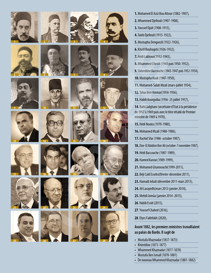 Le gouvernement Fakhfakh a obtenu mercredi après-midi la confiance de l’ARP avec 129 voix pour, 77 contre et une abstention sur 204 votants. Elyès Fakhfakh devient ainsi le 28ème Chef de gouvernement à occuper le poste. La fonction, sous quatre appellations différentes, remonte à 133 ans lorsqu’elle a été étrennée en 1882, sous la dynastie husseinite, par Mohamed El Aziz Bou Attour. Le titre a changé au gré des régimes, allant de Grand Vizir, Premier ministre, à président de Conseil et depuis 2013 à chef de gouvernement. Le Pr Mohamed El Aziz Ben Achour a établi pour Leaders la liste suivante des 28 titulaires qui s’y sont succédé:
