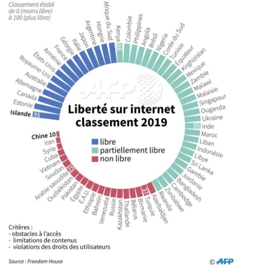 Publié mardi, le rapport a étudié l’état de la liberté sur Internet dans 65 pays et estime qu’il est en déclin pour la neuvième année consécutive, avec un score de 54/100 contre 55/100 en 2018.