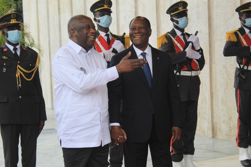 « Je suis content de te voir », a dit M. Alassane Ouattara, alors qu’il donnait des accolades à son hôte sur le perron du petit palais, à la présidence de la République. Il a demandé à l’ancien président d’enlever son masque pour des prises de vues.