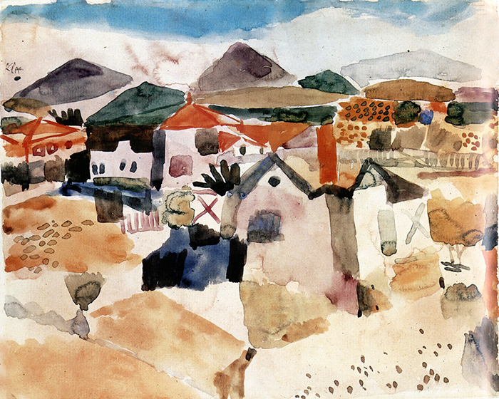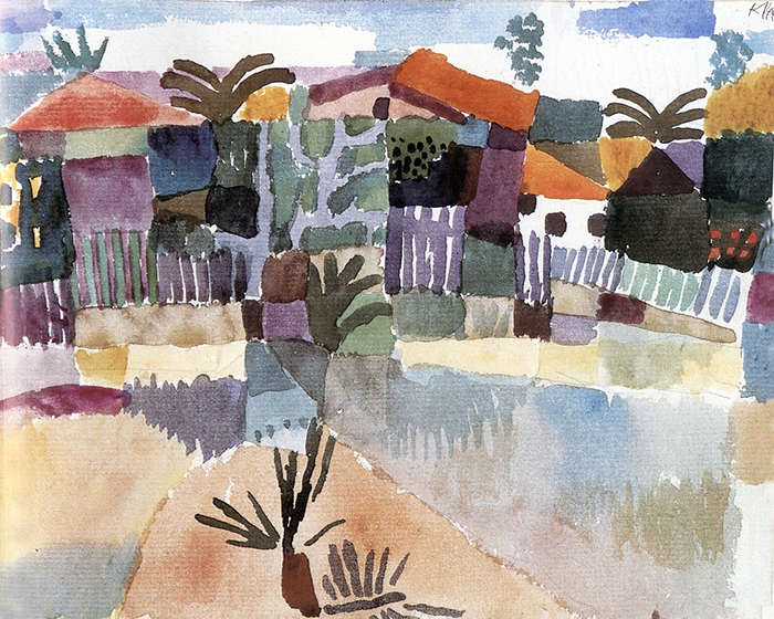 En Tunisie, la lumière tombe presque droit du ciel. Elle efface les ombres. Les surfaces deviennent des plans autonomes. Cette absence d’ombre influence directement les tableaux ultérieurs de Klee : des aplats lumineux, sans hiérarchie.