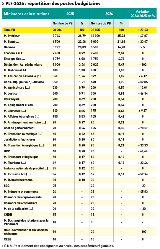 Le ministère de l’Inclusion économique (…), qui comporte aussi l’emploi, et le ministère de la Solidarité (…) ont connu respectivement une hausse de 45,83% (24 PB en 2025 et 35 PB en 2026) et de 50% (20 PB en 2025 et 30 PB en 2026). En fait, ce sont là des « miettes » pour un « Etat social ». C’est surtout le cas de l’inspection du travail qui fait largement défaut, compte tenu de l’effectif plus que symbolique des inspecteurs du travail (moins de 80 au niveau national), et encore plus de la médecine du travail, quasi-inexistante. Au niveau du ministère de l’Enseignement supérieur (…), le nombre de PB prévu est identique à celui de 2025 (1 759 PB), malgré le manque important d’enseignants dans les universités. Le% par rapport au total des PB a même diminué pour passer de 6,08%, en 2025, à 4,76%, en 2026. D’où, là aussi, une baisse relative. Certains ministères ou institutions ont même connu une baisse absolue des PB en 2026, par rapport à 2025. C’est notamment le cas du ministère de la Défense, soit – 5%, du ministère de l’Agriculture (…), soit – 13,04%, du Secrétariat général du gouvernement, soit – 20%, et du Haut- Commissariat au Plan (HCP), soit – 66,66% (60 PB en 2025 et 20 PB en 2026).