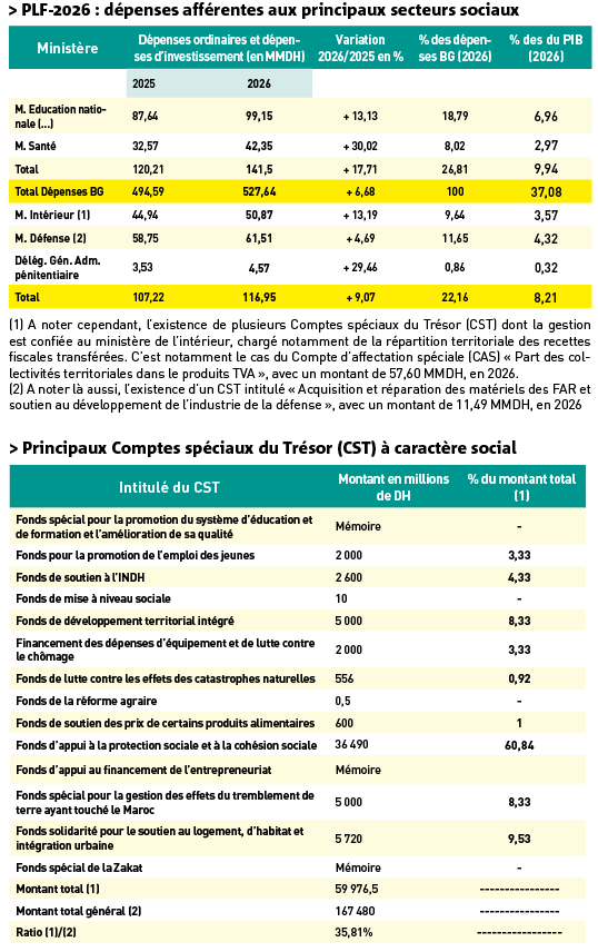 A lui seul, le « Fonds d’appui à la protection sociale et à la cohésion sociale » représente 60,84% du montant des ressources des 14 CST recensés et ayant un lien direct avec le « social ». Certains CST ont connu une hausse importante dans le PLF-2026. C’est le cas du « Fonds pour la promotion de l’emploi des jeunes » qui est passé de 888 MDH, en 2025, à 2 000 MDH, en 2026, soit une hausse de 125%.