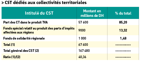 Les inégalités territoriales sont l’une des principales caractéristiques soulignées officiellement. Pourtant, les collectivités territoriales (CT) disposent de «recettes fiscales transférées» assez importantes, représentant plus de 80% du montant global des recettes fiscales locales (recettes fiscales transférées, recettes fiscales gérées par l’Etat pour le compte des CT et recettes fiscales propres). Le CST le plus important est intitulé «Part des CT dans le produit TVA».