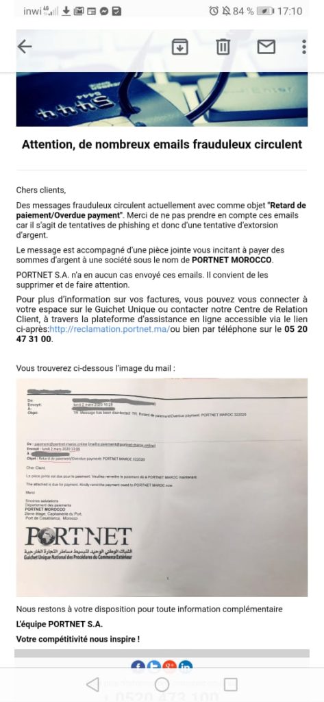 Portnet vient de diffuser un avertissement à ses clients. Le Guichet Unique National de facilitation de l’ensemble des procédures portuaires et du commerce leur demande de ne pas prendre en compte les emails ayant comme objet « Retard de paiement/Overdue payment ».