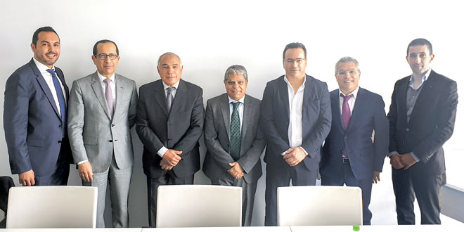 De gauche à droite, Nabil Amar (DG adjoint et administrateur de Cash Plus), Saâd Bendidi (du Fonds Mediterrania Capital), Abdelbaki Amar (actionnaire de Cash Plus), Karim Tazi (actionnaire du groupe Richbond), Belkassem Amar (actionnaire de Cash Plus), Nascer Tazi (président du pôle industriel de Richbond) et Hatim Benahmed (Meditarrania Capital) (Ph. Richbond)