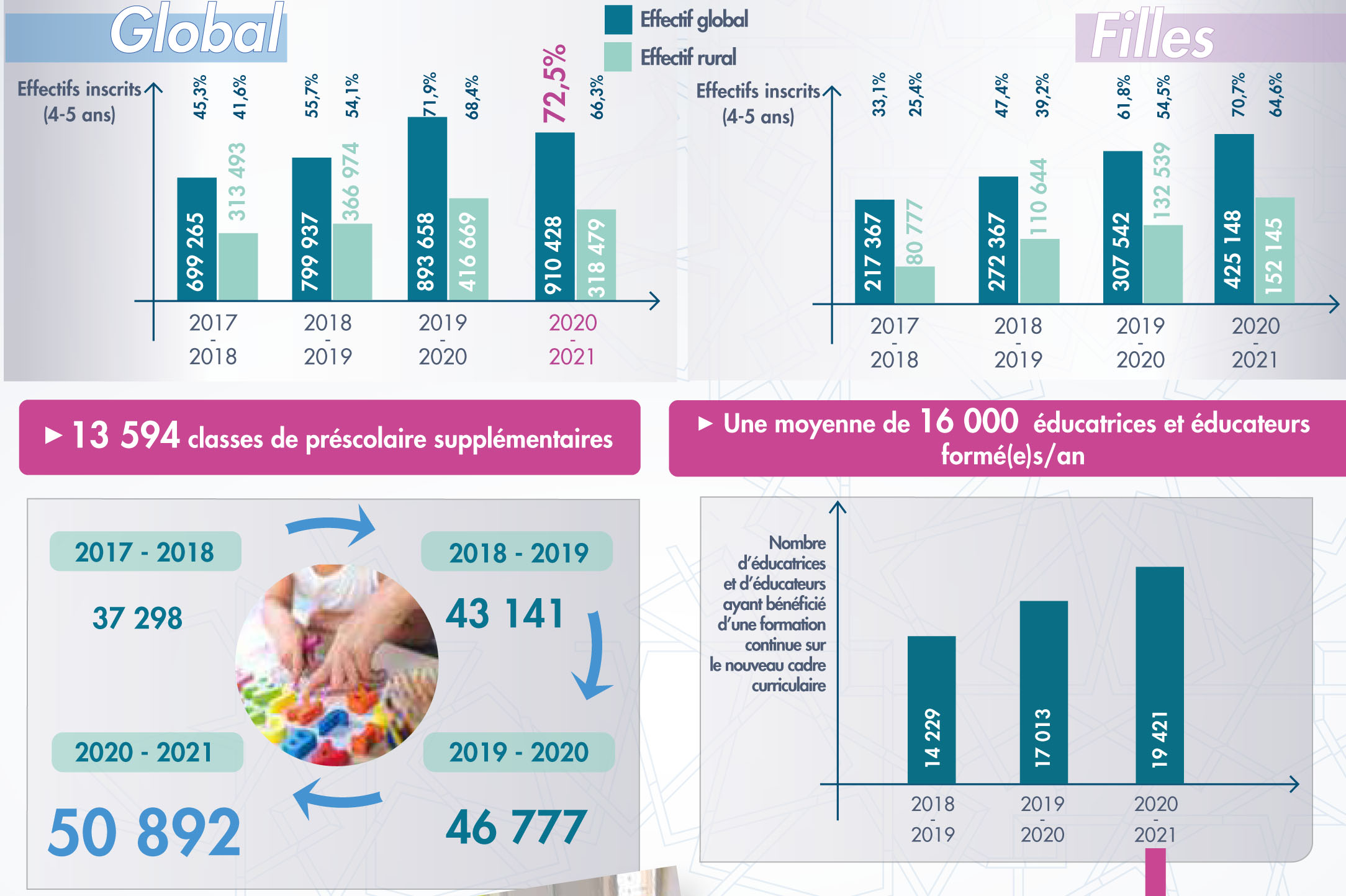 En moyenne 16.000 éducateurs ont été formés durant ces trois dernières années (2018 -2020). Avec le concours de l’Unicef, 19.421 éducatrices et éducateurs ont bénéficié d’une formation continue durant l’année 2020-2021 contre 14.229 en 2018-2019. De plus, 13.594 classes supplémentaires ont été mises en place entre 2017 et 2020. Ce qui porte le nombre de ces classes à 50.892 durant l’année scolaire 2020-2021.