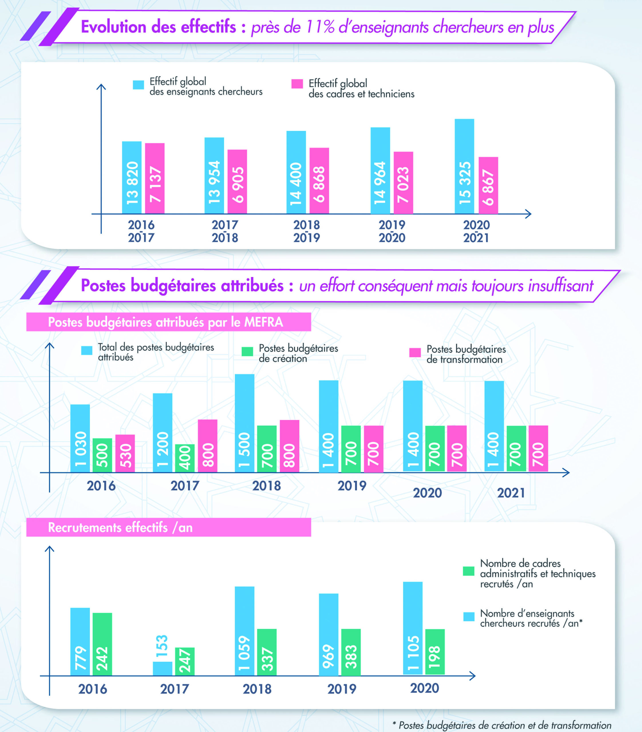 Les ressources humaines sont la clé de réussite du développement dans tous les secteurs, et plus particulièrement celui de l’éducation nationale et de l’enseigne- ment supérieur. Durant la période 2017-2020, ils sont 3.286 enseignants-cher- cheurs à avoir été recrutés. Il faut dire que le taux des enseignants-chercheurs est en hausse de 10,9% durant ces cinq années. Globalement et pour ce qui est des postes budgétaires attribués, le ministère estime qu’un effort conséquent a été fourni mais qu’il reste toujours insuffisant.