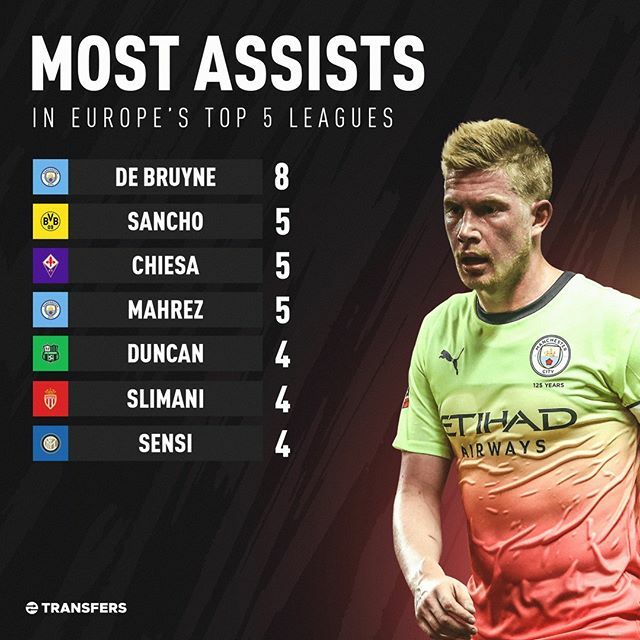 Kevin de Bruyne, lui aussi étincelant cette saison, trône au sommet de ce classement avec 8 passes décisives. Mahrez est deuxième à égalité avec Sancho et Chiesa (5 passes décisives). Le suit Slimani à une longueur avec 4 offrandes.