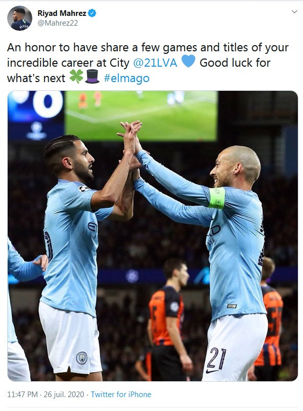 « Un honneur d’avoir partagé quelques matchs et titres remportés durant ton incroyable carrière à Manchester City, David Silva. Bonne chance pour la suite ».