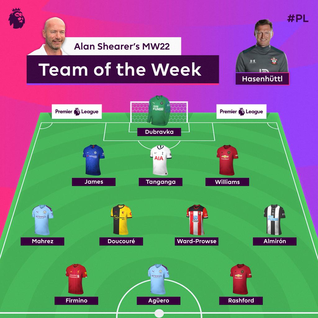 Martin Dubravka (Newcastle United), Reece James (Chelsea), Brandon Williams (Man Utd), Japhet Tanganga (Tottenham), Riyad Mahrez (Man City), Abdoulaye Doucoure (Watford), James Ward-Prowse (Southampton), Miguel Almiron (Newcastle United), Marcus Rashford (Man Utd), Sergio Aguero (Man City), Roberto Firmino (Liverpool)