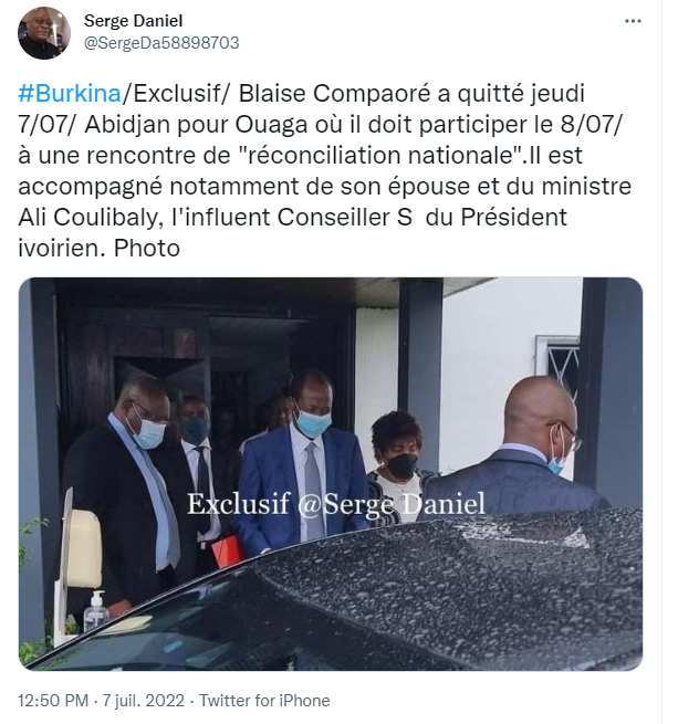L’ex président du Faso Blaise Compaoré et son épouse Chantal ont quitté Abidjan ce jeudi 07 juillet 2022 pour Ouagadougou où il devrait participer demain à une réunion de haut niveau entre le président Damiba et les anciens chefs d’Etats du Burkina, a confirmé le journaliste Serge Daniel. (AIB).