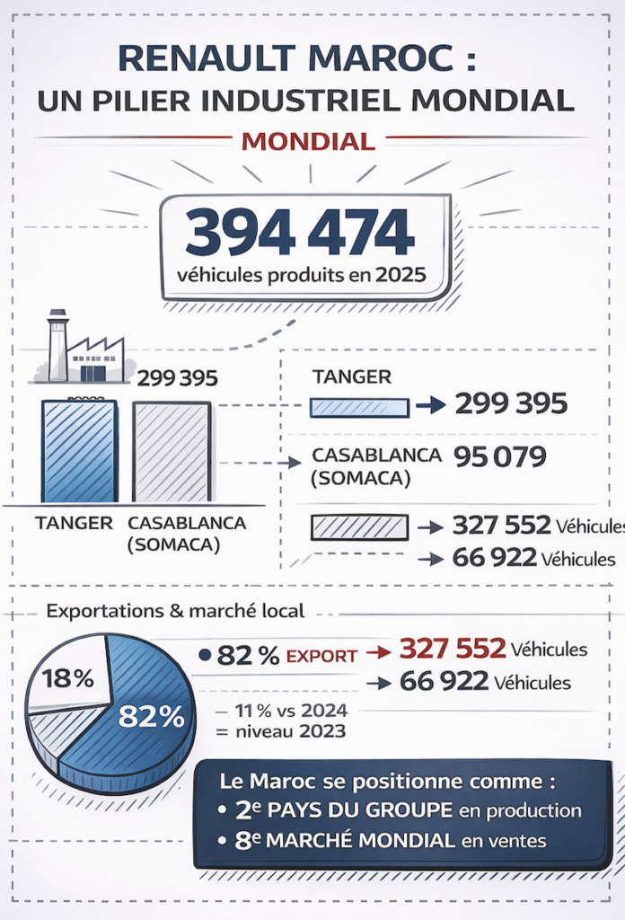 Renault Group Maroc consolide sa position nationale et renforce la place du Royaume dans l’organisation globale du constructeur automobile français. Concrètement, le Maroc s’impose désormais comme le deuxième pays du Groupe en volume de production et le huitième sur le marché mondial en volume de ventes, porté par le dynamisme des marques Renault et Dacia. Comme l’a mis en lumière Mohamed Bachiri, Directeur général de Renault Group Maroc, les sites industriels marocains ont produit 394 474 véhicules en 2025, un chiffre en léger recul de 5 % par rapport au record de 2024, mais en hausse de 3 % par rapport à 2023. Dans le détail, l’usine de Tanger a pour sa part fabriqué 299 395 véhicules, tandis que celle de Casablanca (SOMACA) en a produit 95 079. Plus de 82 % de cette production a été exportée vers 63 pays, soit 327 552 véhicules. Si ce volume recule au global de 11 % par rapport à 2024, il reste proche du niveau de 2023, dans un contexte de forte croissance du marché national, souligne M. Bachiri.