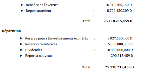 Conformément à la proposition du Conseil d’Administration, l’Assemblée Générale Ordinaire décide d’affecter le bénéfice net de l’exercice 2018 de 16.318.785,150 dinars, ainsi que le report à nouveau, comme suit :