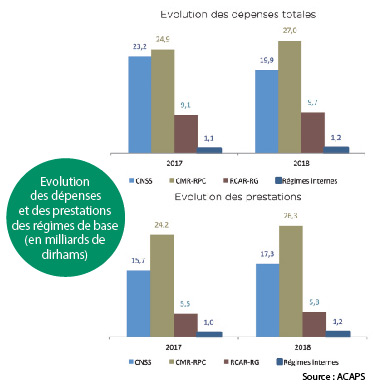S’agissant des dépenses des régimes de base , elles ont atteint 57,8 milliards DH, un chiffre en légère baisse de 0,6% par rapport à 2017. Sur la période 2014-2018 ces dépenses ont enregistré une évolution annuelle moyenne de 7,3%. Les dépenses du régime CMR-RPC et du RCAR-RG ont enregistré des hausses entre les deux exercices de 8,6 et 7,4% respectivement pour atteindre 27 et 9,7 milliards de dirhams, contre une hausse de 12,2% pour les régimes internes. Pour sa part, la CNSS a enregistré une baisse de ses dépenses totales en 2018 de l’ordre de 14,2% pour s’établir à 19,9 milliards de dirhams. Cette baisse est survenue essentiellement suite à la baisse de ses dépenses d’exploitation. Avec une part de 87,6% des dépenses totales, les prestations servies par les régimes de base se sont élevées à 50,6 milliards DH , ce qui représente une hausse de 9 % par rapport à 2017. Le régime CMR-RPC accapare 52 % des prestations des régimes de base, suivi par la CNSS et le RCAR-RG avec des parts de 34,2 et 11,5% respectivement. Celles servies par les régimes internes, représentent pour leur part 2,3% des prestations totales. Les prestations servies par le régime CMR-RPC, qui ont constitué 97,4% des dépenses totales du régime, ont enregistré une hausse de 8,7% et se sont établies à 26,3 milliards DH. Pour la CNSS et le régime RCAR-RG, les prestations ont représenté respectivement 68 et 60,1% de leurs dépenses totales en se situant respectivement à 17,3 milliards et 5,8 milliards DH en hausse de 9,8 et 6,6% par rapport à l’année 2017. Les pensions de retraite et d’invalidité représentent 78,5% des prestations servies par l’ensemble des régimes de base, soit 38,9 milliards de dirhams, contre 9,7% pour les pensions de réversion (4,8 milliards de dirhams). Les allocations familiales ont représenté 11,8% de ces prestations. Les pensions de retraite et d’invalidité représentent, pour leur part, 55,4% du total des prestations pour la CNSS, 84,7% pour le RCAR-RG, 90,9% pour le régime CMR-RPC et 92,3% pour les régimes internes. S’agissant des pensions de réversion, elles représentent 13,5% des prestations pour le RCAR-RG, 11,1,% pour la CNSS, 8,1% pour le régime CMR-RPC et 6,8% pour les régimes internes.