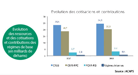 Les régimes de retraite de base ont collecté au titre de l’année 2018 un montant de 48,7 milliards de dirhams de cotisations et contributions. Celles des régimes complémentaires se sont élevées à 7,5 milliards de dirhams. Ces cotisations et contributions ont représenté 74,6% des ressources de ces régimes. Pour la CNSS, les cotisations et contributions se sont élevées à 24,5 milliards DH en progression de 4,6% par rapport à 2017 et ont représenté 87,7% du total des ressources du régime. Celles du régime CMR-RPC, qui ont constitué 83,8% du total de ses ressources, ont atteint 20,3 milliards DH contre 18,7 milliards DH en 2017. Pour ce qui est du régime du RCAR RG, elles ont atteint un montant de 3,3 milliards DH, en hausse de 24,9% par rapport à l’exercice précédent. Elles ont représenté 30 % du total des ressources du régime. La CNSS et le régime CMR-RPC, ont collecté respectivement 50,4% et 41,8% de ces cotisations et contributions, contre seulement 6,8% pour le RCAR-RG et 1% pour les régimes internes.