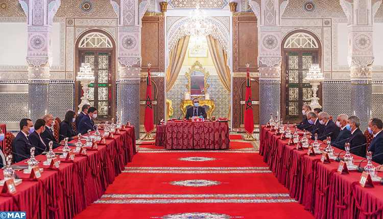 Sa Majesté le Roi Mohammed VI, que Dieu L’assiste, a présidé, dimanche au Palais Royal à Fès, un Conseil des ministres, consacré à l’examen des Orientations générales du projet de loi de finances pour l’année 2022, l’adoption d’un projet de loi organique et de nombre d’accords internationaux, ainsi qu’à des nominations aux fonctions supérieures, indique un communiqué lu par le porte-parole du Palais Royal, M. Abdelhak Lamrini.