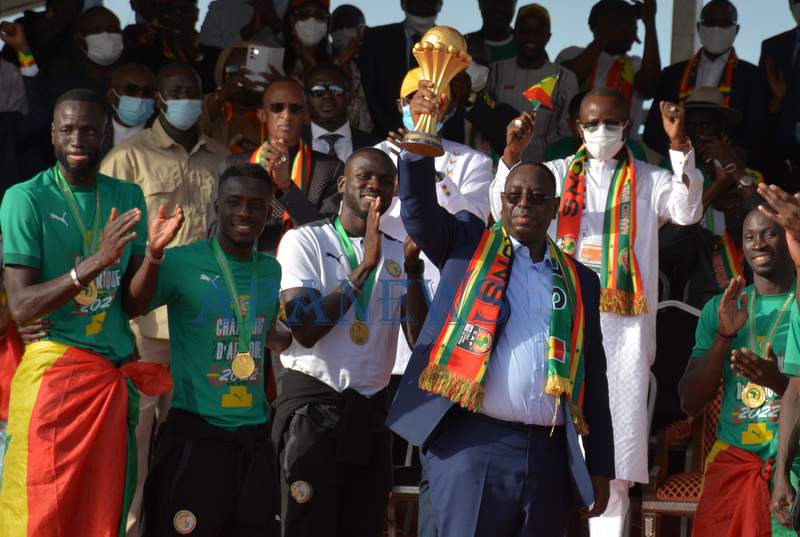 Les joueurs de l’équipe nationale du Sénégal, vainqueurs de la Can 2021 au Cameroun, ont été récompensés lors d’une cérémonie solennelle organisée ce mardi 8 février 2021 devant le Palais de la République.Le président Macky Sall a honoré l’ensemble des membres de l’encadrement technique des Lions du Sénégal revenus de Douala au Cameroun. En présence de toute la République, Macky Sall a remercié au nom du peuple sénégalais les Lions du Sénégal pour leur sacre historique à la Can 2021 au Cameroun.