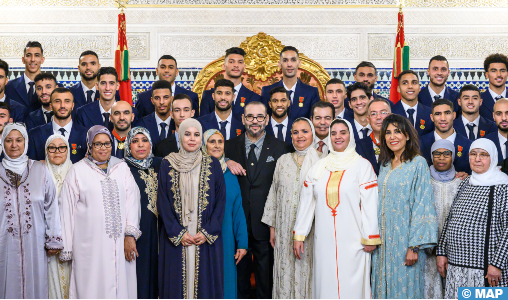 Sa Majesté le Roi Mohammed VI, que Dieu L’assiste, accompagné de SAR le Prince Héritier Moulay El Hassan et de SAR le Prince Moulay Rachid, a reçu mardi à la Salle du Trône au Palais Royal à Rabat, les membres de l’Equipe Nationale de football, après leur brillante prestation àAuteur: Challenge avec MAP
