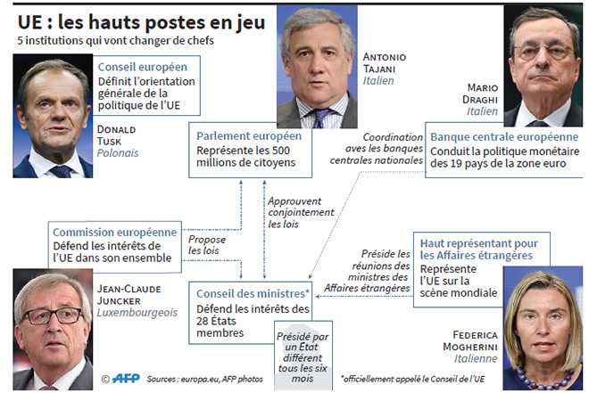 L’élu, qui succédera le 1er novembre à Jean-Claude Juncker, devra obtenir le soutien de 21 des 28 dirigeants européens et rallier une majorité d’au moins 376 voix au Parlement. «Une répartition des quatre postes de pouvoir de l’UE a été proposée», ont indiqué plusieurs responsables européens. Le PPE, premier groupe au Parlement, revendique la présidence de la Commission européenne. Les libéraux désirent quant à eux la présidence du Conseil européen et les socialistes obtiendraient le poste de chef de la diplomatie européenne.
